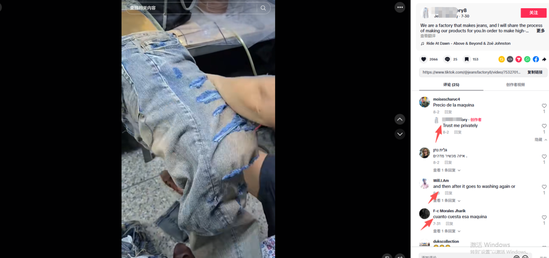 2. 低成本接触精准客户传统外贸展会成本高昂,单个客户接触成本可达数百元。而在TikTok上,通过精准标签(如#denimmanufacturer、#jeansfactory)和内容运营,厂家能够以极低成本接触到全球范围内的批发商、品牌买手和零售商。